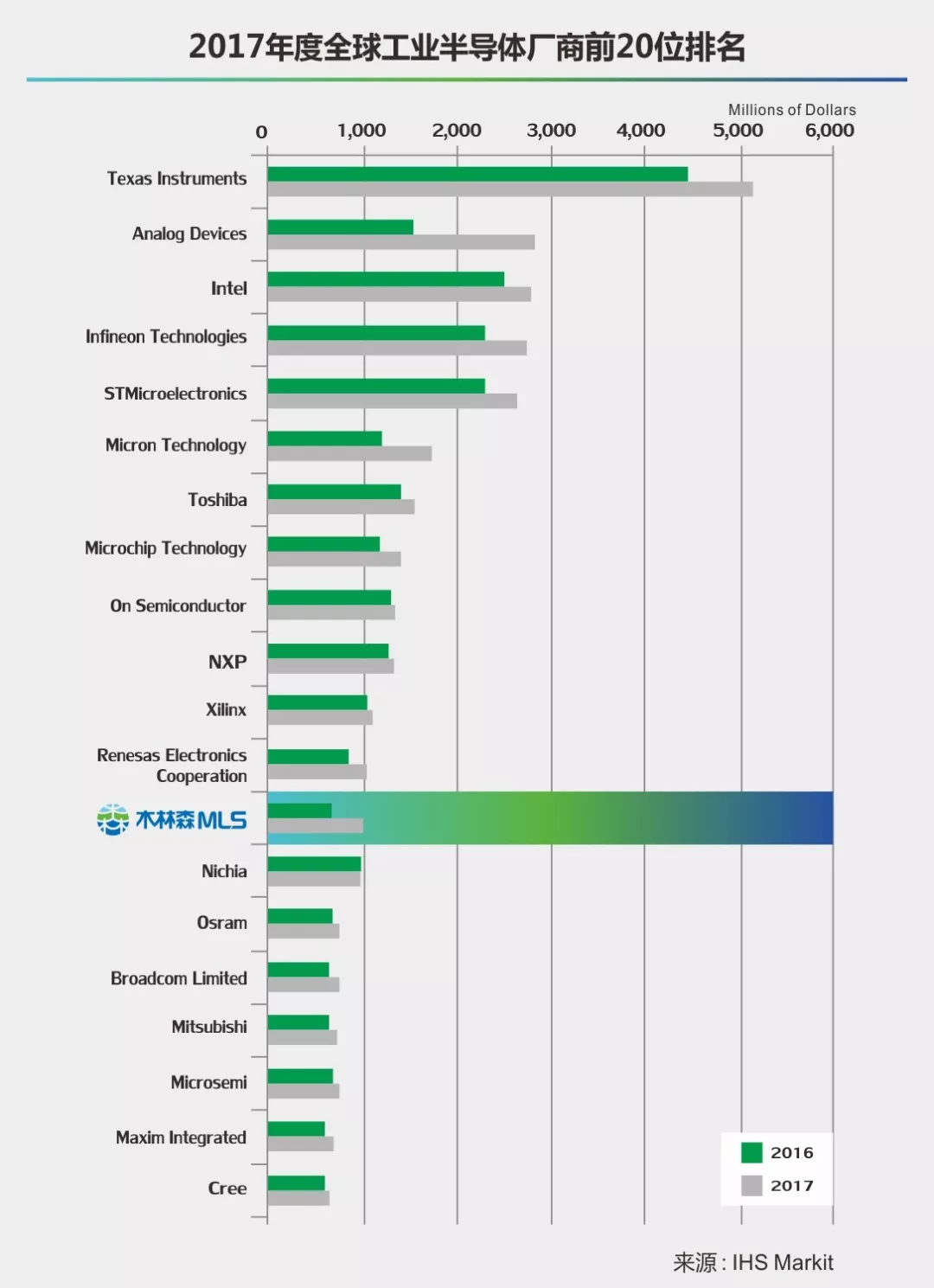 由于LED照明市场的持续强劲,光学半导体取得了IHS Markit所称的出色表现。在LED照明方面,与2016年一样,共有四家厂商登榜,分别是木林森MLS、日亚化学Nichia、欧司朗Osram和和科锐Cree,但排名发生了变化,木林森由2016年的18上升到13位,超越日亚化学,是照明厂商在该榜单的最好名次。